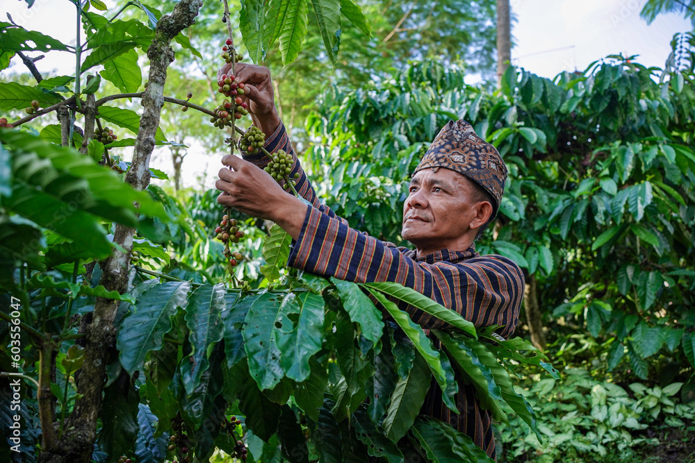 An Indonesian coffee farmer wearing local traditional clothing picking ripe coffee beans