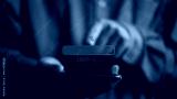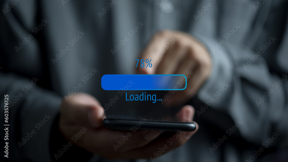 Hand holding mobile smartphone digital technology communication online loading data icon software system application virtual screen concept.