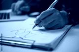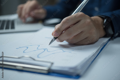 businessman holding pen pointing document graph report financial marketing, research, business chart analysis development, planning, management, strategy concept.