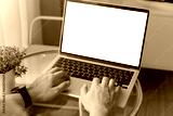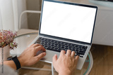 hand using laptop and typing on keyboard with mockup of blank screen.