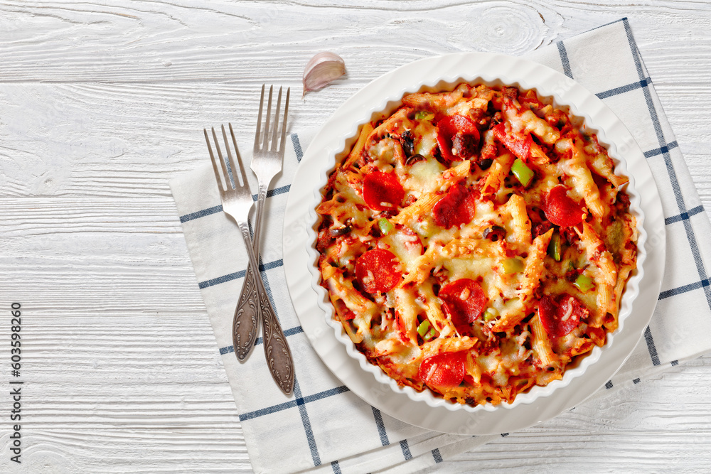 Pizza Casserole of pasta, beef, pepperoni, cheese