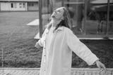 carefree yoga man in white linen shirt standing with outstretched hands and looking up near blurred house
