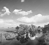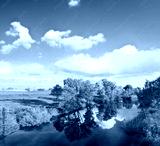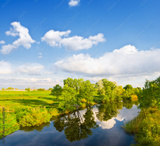 small calm river with forest on coast under cloudy sky, summer rural contryside landscape