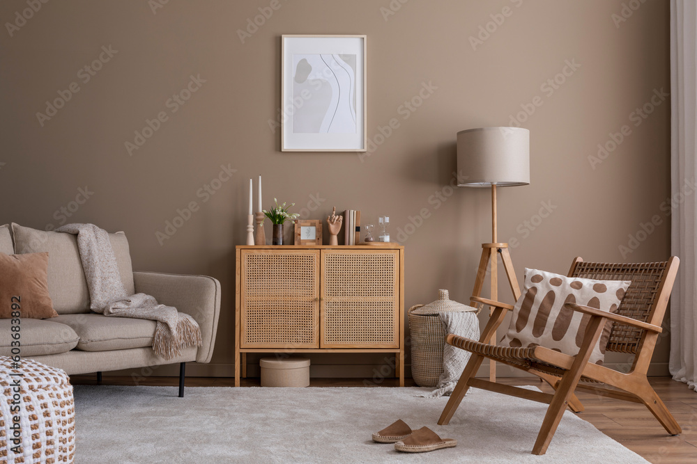 Creative composition of living room interior with mock up poster frame, rattan sideboard, beige sofa, bright carpet, wooden armchair, stylish lamp and personal accessories. Home decor. Template.