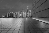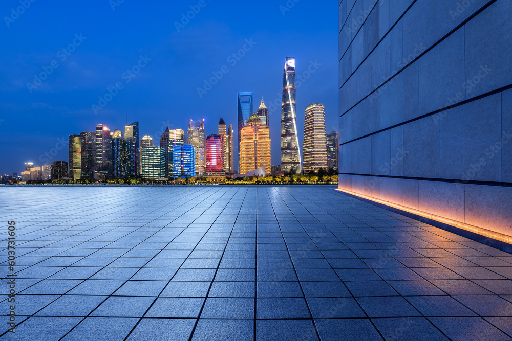 Empty square floor and city skyline with modern building at night in Shanghai, China.
