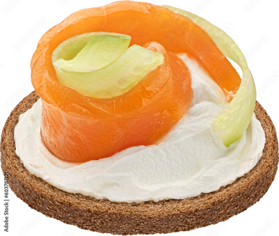 Wholegrain rye bread slice with smoked salmon, cucumber slices and cream cheese isolated on white background