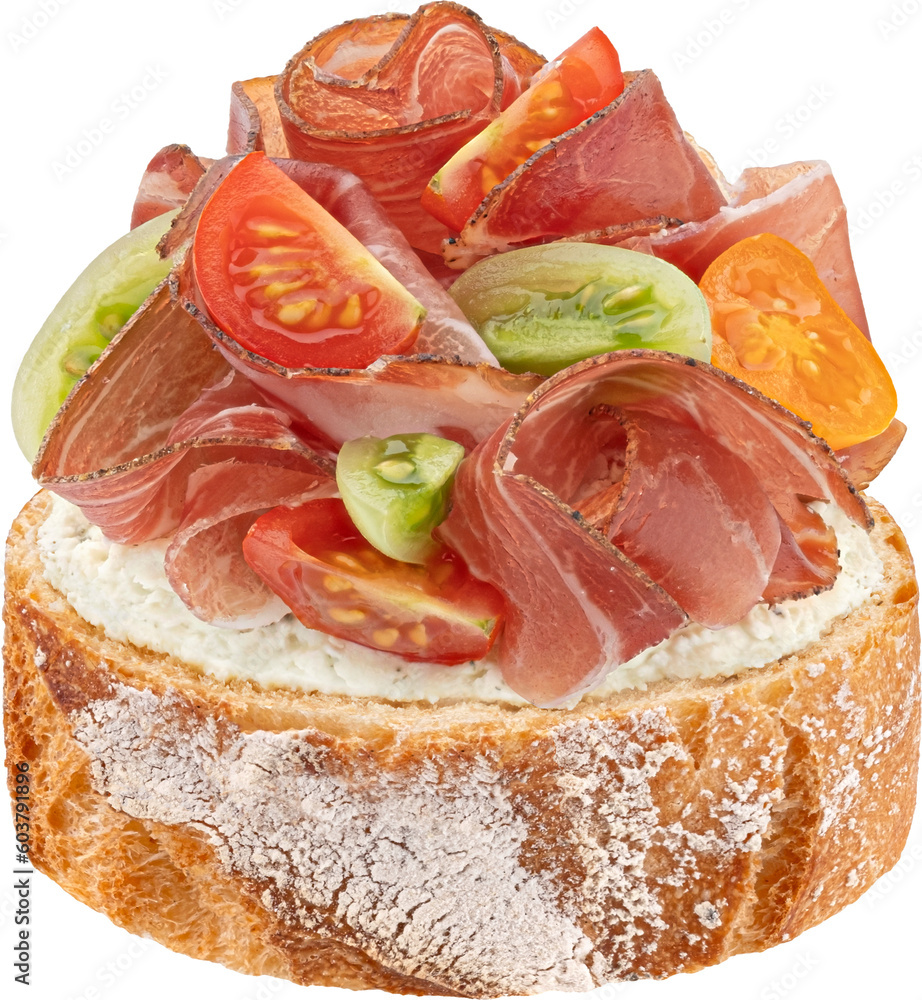 Italian prosciutto crudo sandwich, spanish jamon on toasted bread slice, serrano ham bruschetta isolated