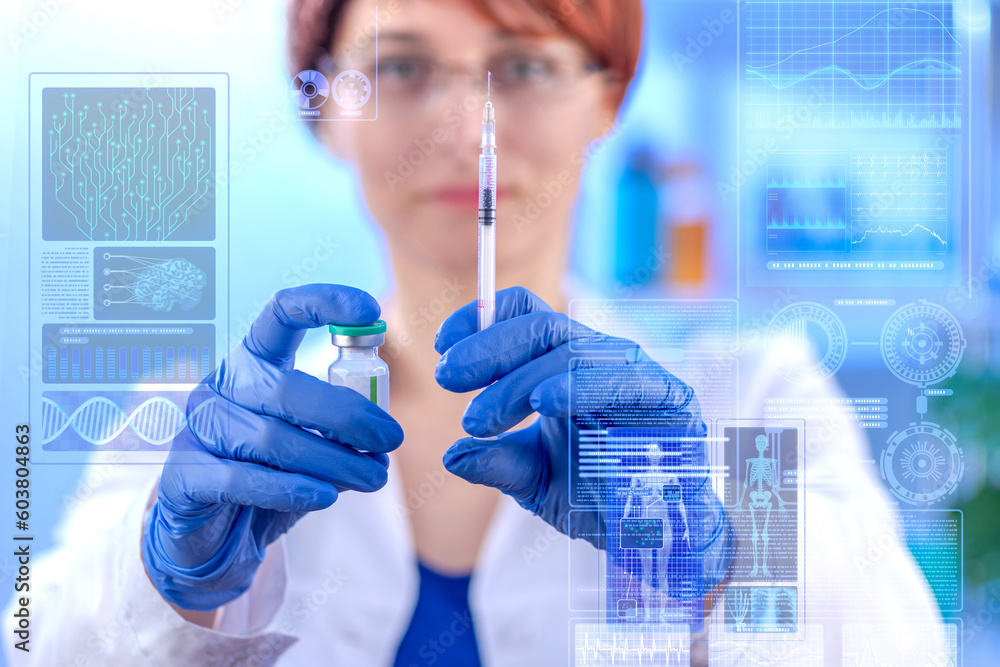 Futuristic Holographic Interface, showing medical Data in augmented reality from artificial intelligence AI. Hands in medical gloves holding a syringe and ampoule