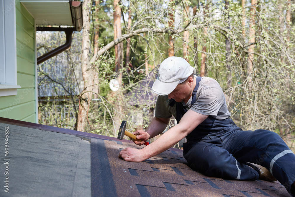 A worker installs a soft roof on the roof of a country house. Made of modified bitumen and stone chips based on fiberglass.