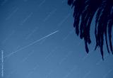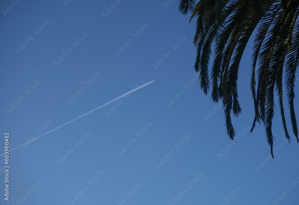plane and vapour trail. trace of an airplane in the blue sky. top View of palm trees, sky and aircraft flying. Palm trees in Batumi, Georgia.