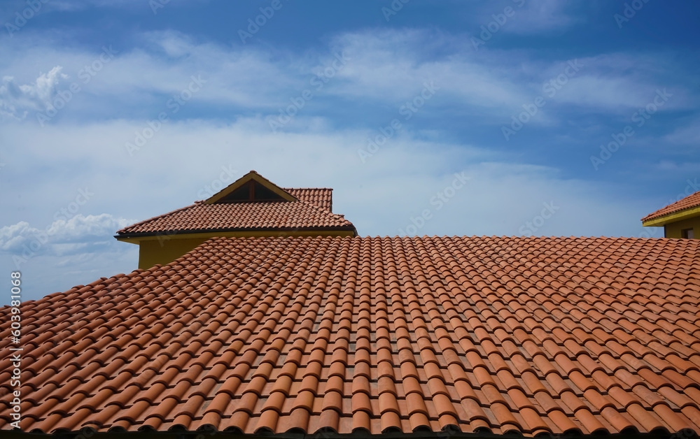 new red or brown roof texture tile. Ceramic Tiled Roof On wooden rural House on blue cloudy sky background.