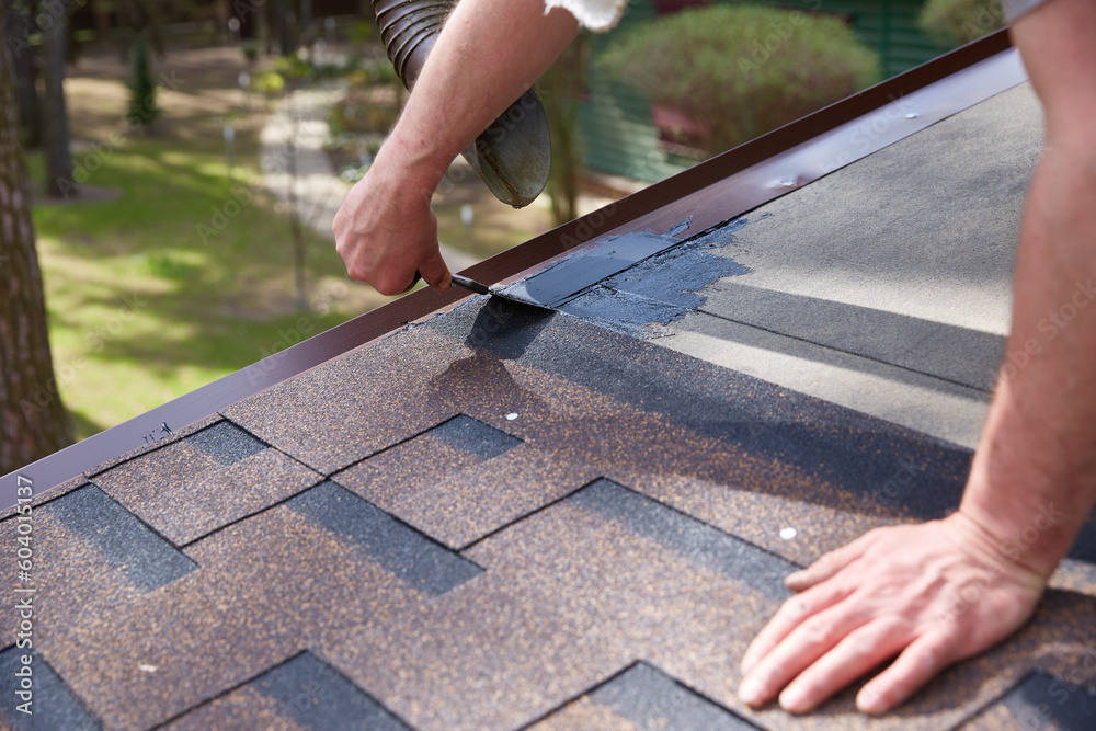 Worker's hands are smeared with waterproofing mastic for the roof.