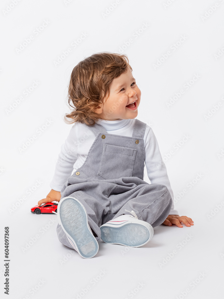 A cheerful laughing Caucasian toddler 2 years old with curly hair in a gray jumpsuit and a white turtleneck is playing with a car on the floor.