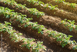 green rows of potato tops, fields of ripening Solanum agro culture, vegetable plants, agricultural concept, environmentally friendly plants, vegetable production, fertilizer application, food crisis