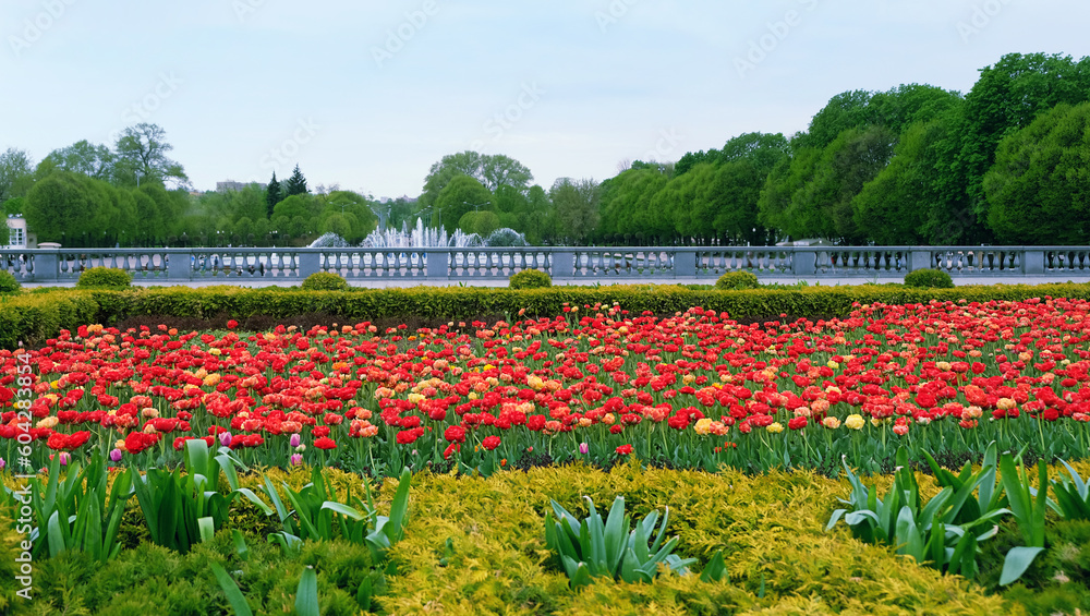 Beautiful big flower bed with colorful tulip flowers in city park. Natural floral abstract background. spring season. garden landscape design. Gorky Park, Central Park culture and rest, Moscow, Russia