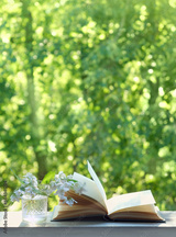 Jasmine flowers in vase and open book on table in garden, abstract green natural background. symbol of spring season. beautiful romantic floral composition. reading, relax time, leisure concept