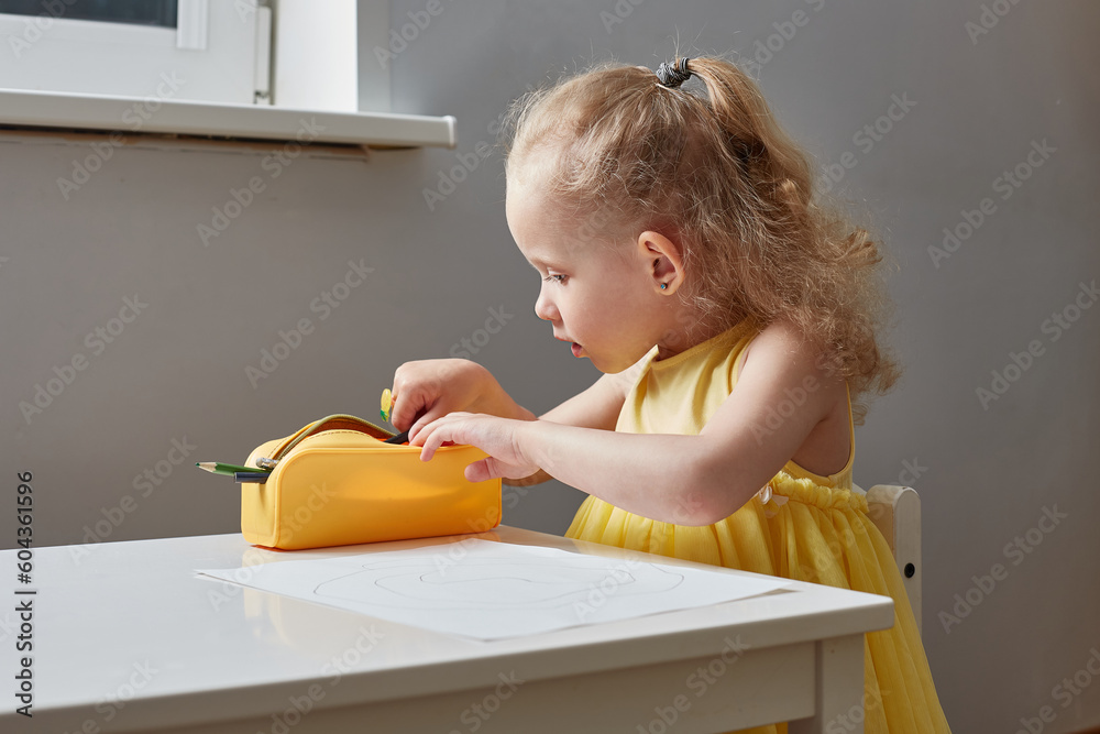 The girl picking up pencils in a pencil case