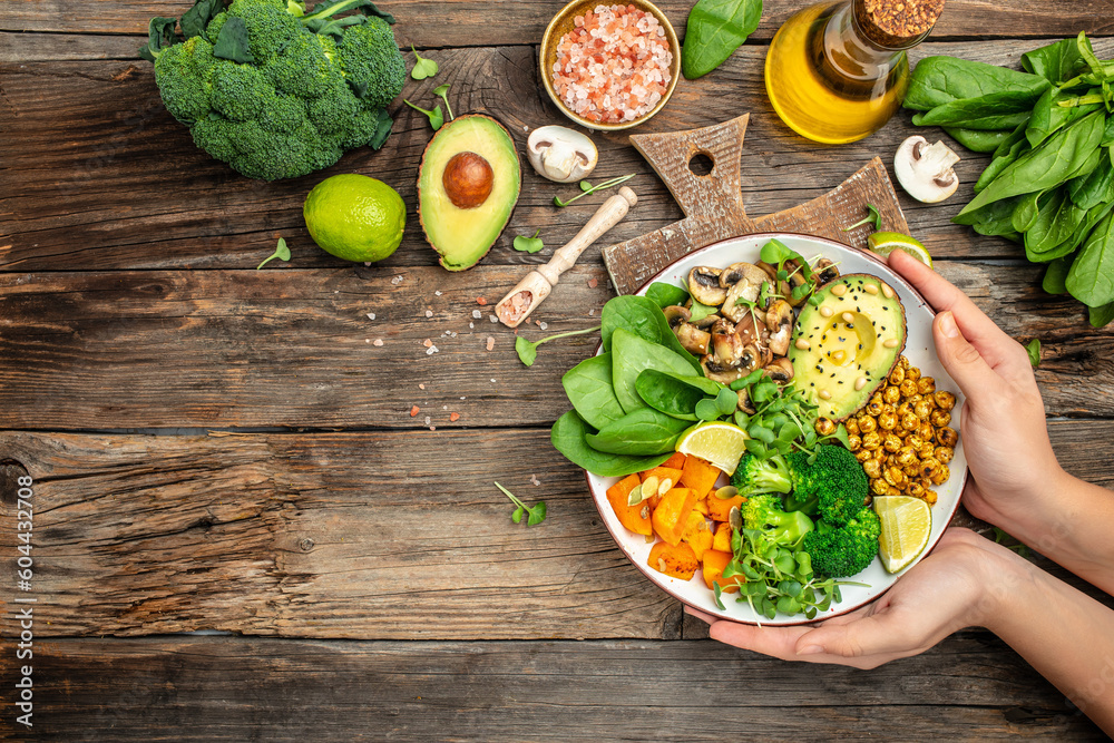 Girl holding plate with hands vegan breakfast. meal in bowl with avocado, mushrooms, broccoli, spinach, chickpeas, pumpkin. top view