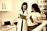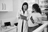 Smiling mature pregnant woman visits doctor gynecologist obstetrician in gynecological clinic, during regular medical checkup. Pregnancy and maternity concept. Healthcare and medicine. Ultrasonography