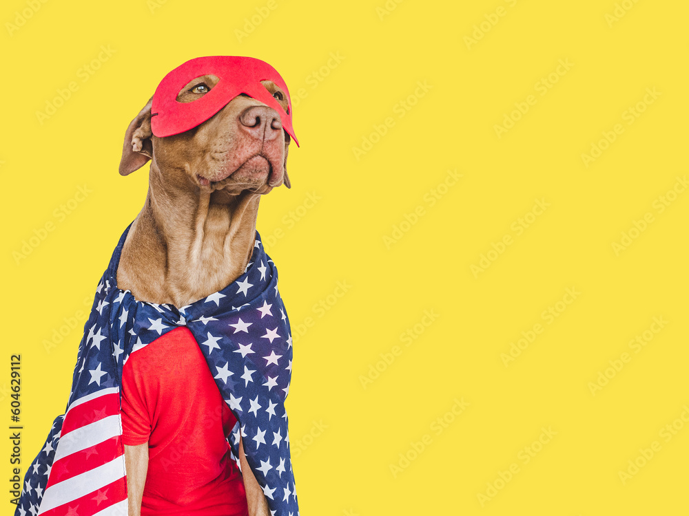 Cute brown puppy, Superhero costume and American Flag. Close-up, indoors. Studio shot. Congratulations for family, loved ones, friends and colleagues. Pet care concept