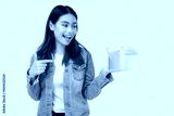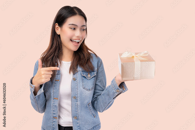 Surprised young woman holding gift box and get excited by open mouth Standing over pink background Beautiful girl happy smile hold New year Birthday Chirstmas gift box present Use for advertisement