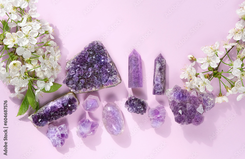 amethyst minerals set and white spring flowers on abstract light violet background. gemstones for esoteric spiritual practice, magic Crystal Ritual. Witchcraft concept. flat lay. copy space