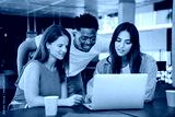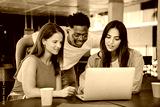 Group of multiracial happy teenage students using laptop, working on university assignment homework project in college library. Meeting of diverse young people looking information on computer. High