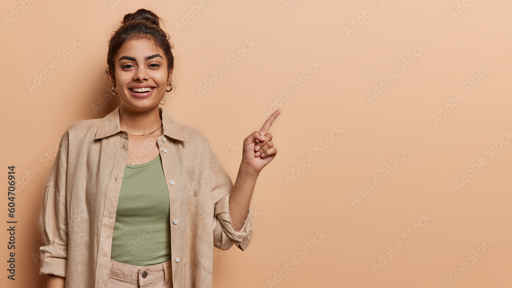 Studio shot of pretty young Indian girl points index finger at mock up copy space demonstrates new offer or great opportunities has happy smile on face wears shirt isolated over brown background