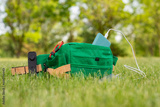 Bag with a smartphone is charged using a power bank. Portable charger in nature and travel.