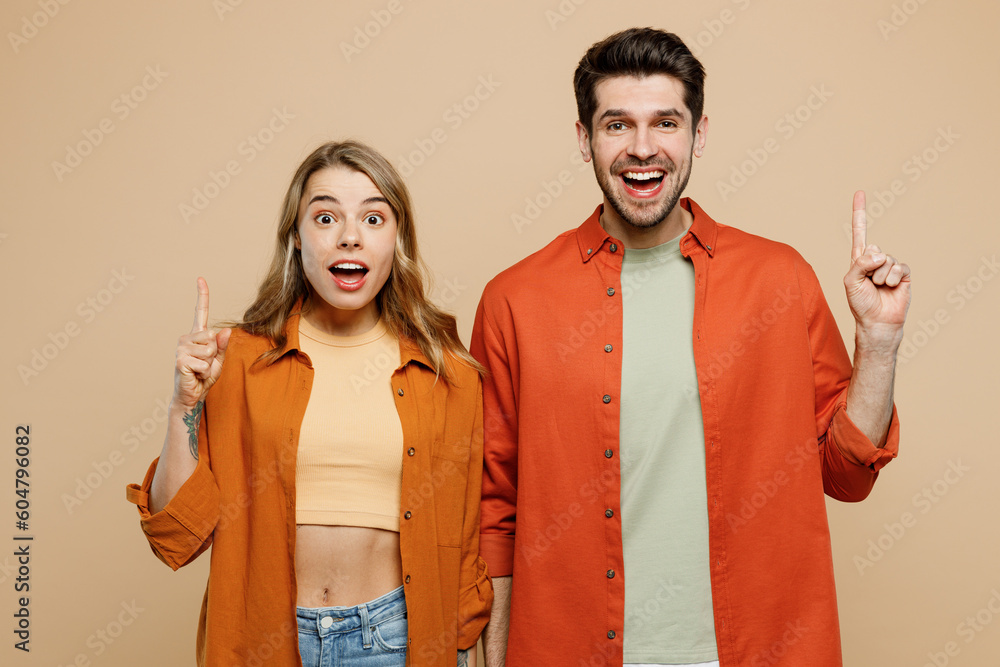 Young insighted smart proactive couple two friends family man woman wear casual clothes hold index finger up with great new idea together isolated on pastel plain light beige color background studio.