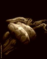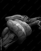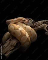 Yellow python with brown spots wrapped around a curved branch. A portrait of a ball python against a black background. Pet snake with dark eyes. Exotic pet portrait.Vertical photo of regius