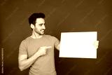 Caucasian young man in yellow shirt with blank sign in studio.