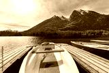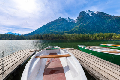 Boat dock with rowboats on Hintersee in Ramsau with a mountain idyll (Bavaria, Germany)