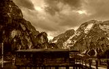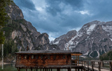 Boathouse of Lake Prags surrounded by the Italian Dolomites