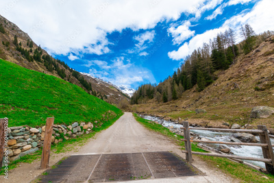 Hiking path between the river Rienz and green meadow at Val Pusteria in the italian Alps