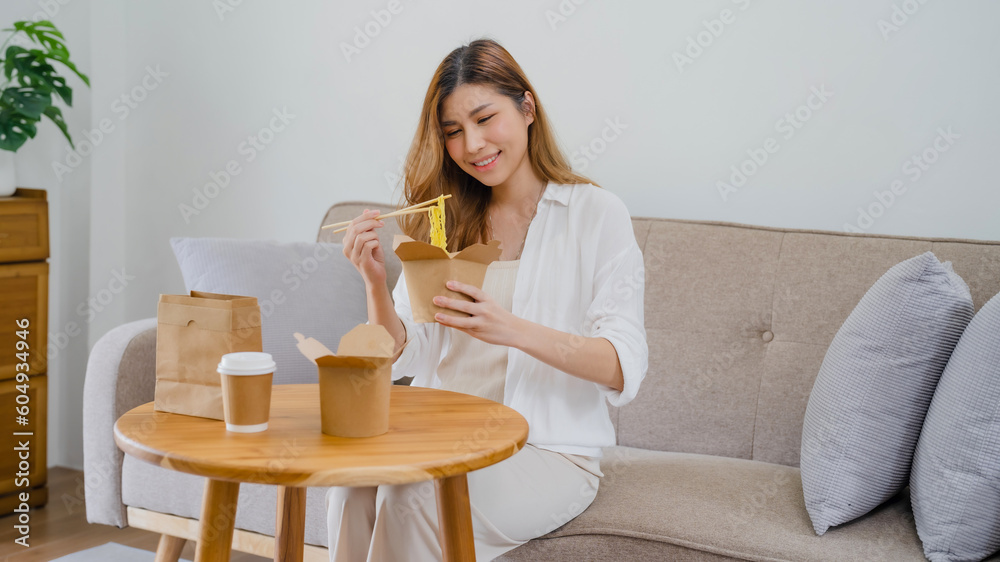 Food delivery. Happy asian woman eating noodles with chopsticks unpacking takeaway food at home.
