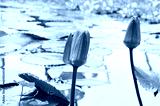 Two beautiful pink water lily buds with green leaves in a pond on a sunny day