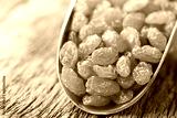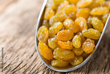 Golden seedless sultana raisins in metal scoop on wood (Selective Focus, Focus on the front of several raisins in the front)