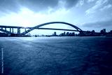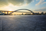 Asphalt road and bridge with city skyline at sunset