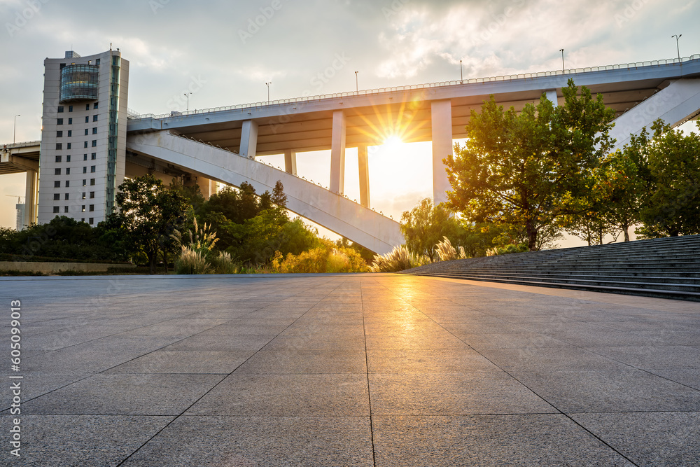 Empty square floor and bridge architecture sceney at sunset