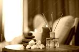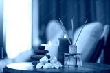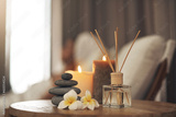 Spa, aromatherapy and candles on table for zen, calm and peace to relax for health and wellness. Stones, flowers and diffuser for self care, holistic massage and hospitality at a beauty salon