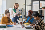 Young smiling teacher conducting foreign language lesson with students while they sitting at table with books and computer