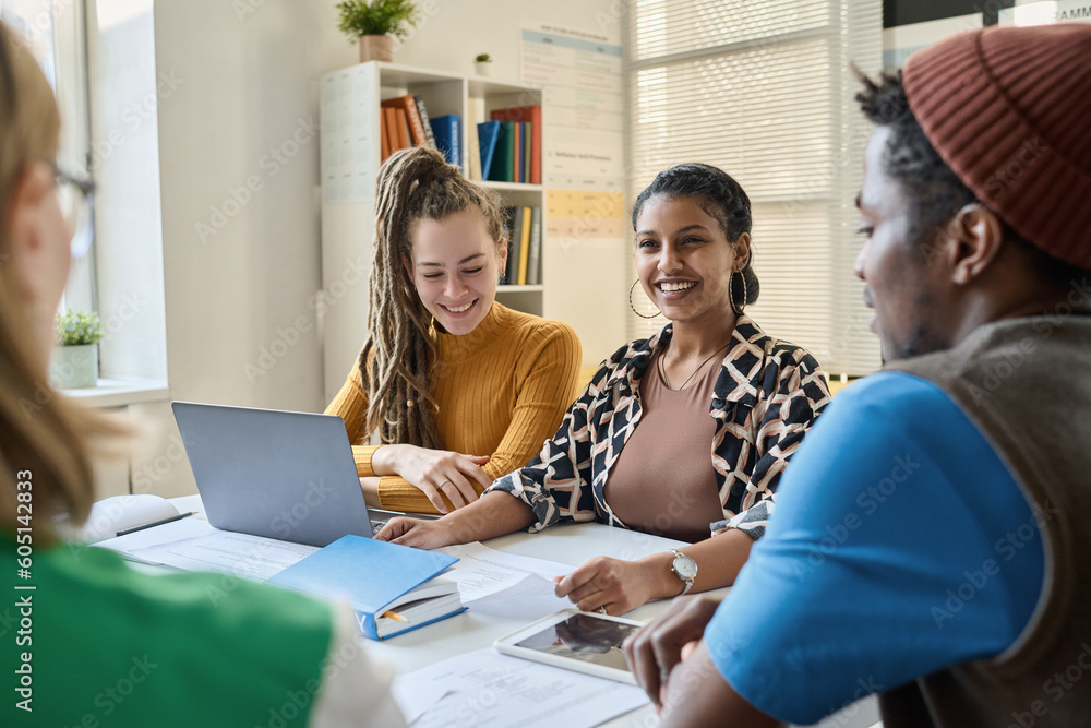 Smiling girl talking to teacher while sitting at table with her classmates during lesson in class