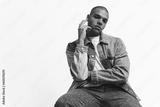 medium shot of an attractive young man in jeans sitting on a chair and posing, white background. High quality photo