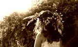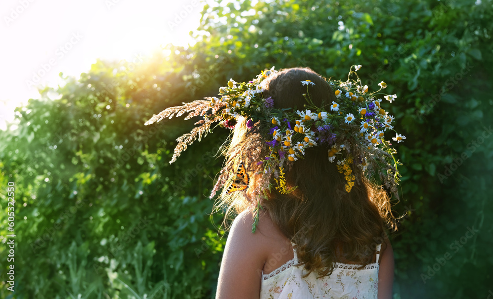Girl in flower wreath on sunny green abstract natural background. Floral crown, symbol of Midsummer, summer season. Beautiful harmony atmosphere, save nature, ecology, wild nature lover concept.