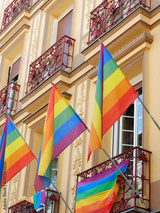Many LGBT gay flags hanging and waving on the festive vintage building in the centre of Madrid, Spain. Vertical photo of equality symbol on gay pride day