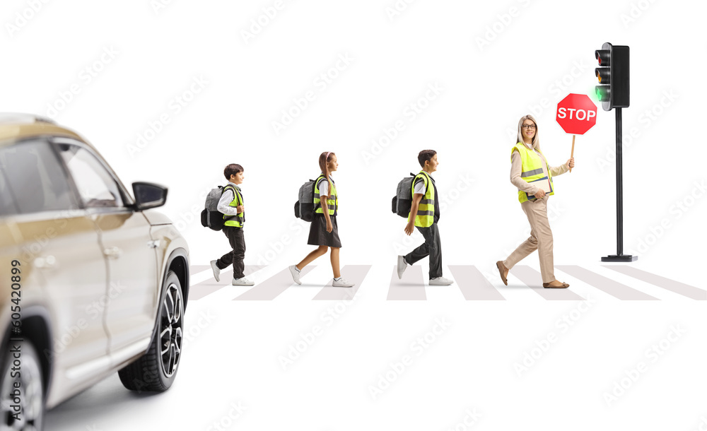 Teacher and schoolchildren in safety vests crossing a street and carrying stop sign