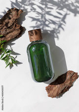 Green transparent cosmetic bottle with recyclable wooden cap on the white sunny background. Natural eco cosmetics concept close up