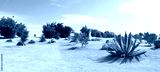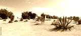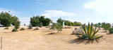 succulent trees and plants in desert sands in sunny day with blue sky, natural background. typical arid climate landscape. nature reserve area. hot sunny weather. banner. template for design
