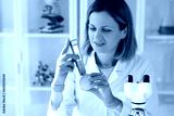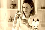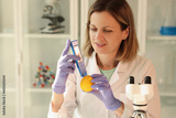 Scientist examines mandarin with equipment in laboratory